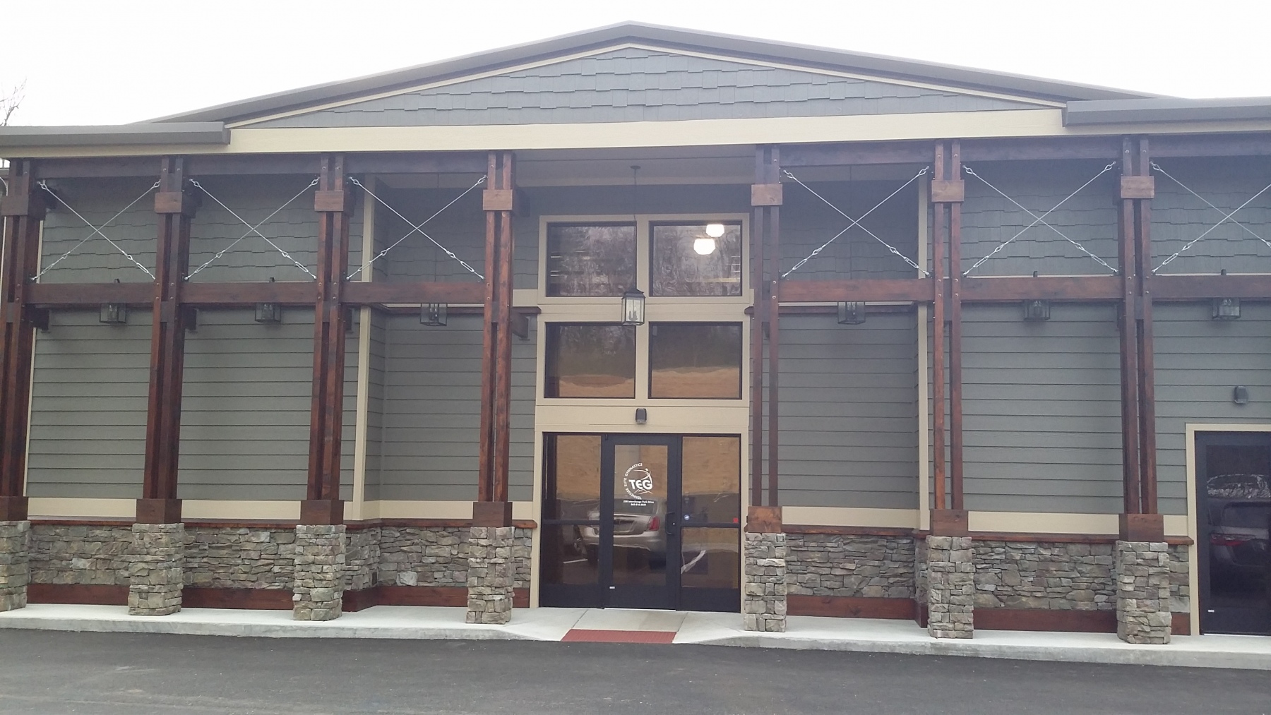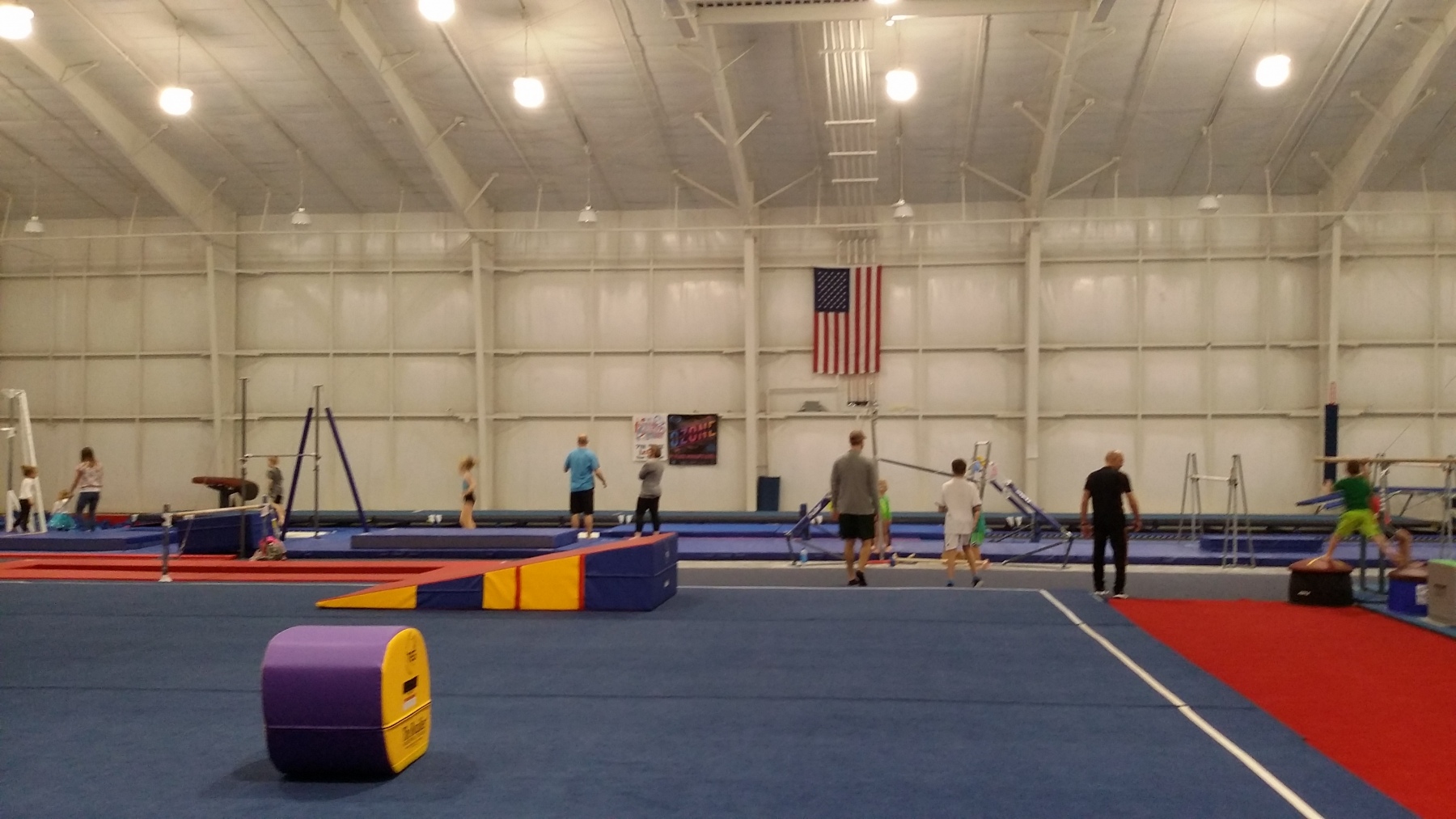 This expansive gymnasium combines a professional grade training floor with a striking exterior marked by heavy timber columns, stone masonry, and industrial steel accents. Inside, the open-span construction provides ample space for a full range of gymnastics equipment under high ceilings and bright, performance focused lighting.