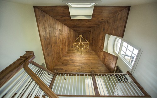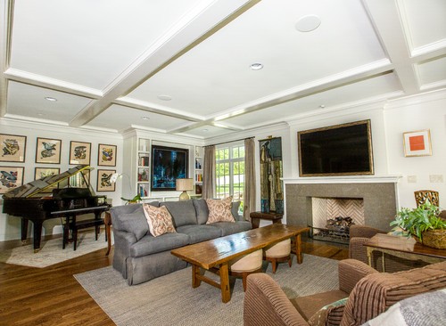 This home features a grand vaulted foyer with wood-planked ceilings and a chef’s kitchen anchored by a massive butcher-block island and brass accents. The living spaces are defined by elegant coffered ceilings and stone fireplaces, creating a perfect balance of luxury and comfort.
